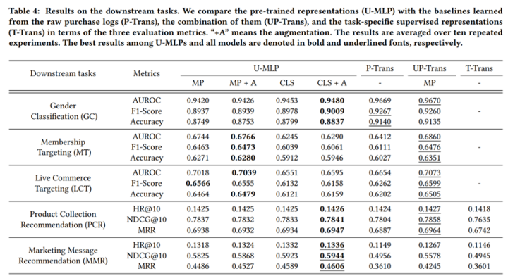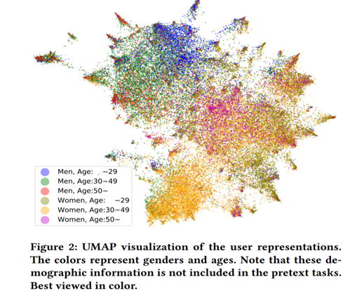论文动机也是认为学习general-purpose的表征能力在机器学习社区已经取得了很大的成功,同时指出在电商场景下,学习one4all的表征,可以用来做很多下游任务,例如用户画像预测、推送和推荐系统。为此,作者们系统的比较了电商场景下通用用户表征的建模方式和迁移效果,提出ShopperBERT模型,论文数据规模相当庞大,达到8亿点击行为(PeterRec数据接近1亿的行为),论文结果展示出预训练在多个下游任务上可以取得SOTA效果,该论文比较精彩的地方是做了非常广泛的分析实验,很有参考价值。