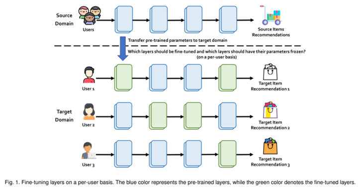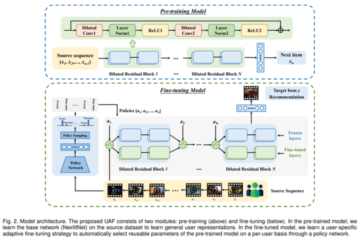 本文作者动机与以上几篇论文类似,也是想尝试通过迁移学习解决用户冷启动问题,但是不同以上文章,论文提出了一种personalized微调方式,针对不同的用户采用不同的policy微调机制,作者强调pre-training的残差块不一定需要微调,有些用户的兴趣偏好(尤其是行为比较少的用户)可能会跟pre-training场景更加相似,那么这种情况大可不需要微调,直接使用pretraining自带的残差块即可。论文通过强化学习手段实现user-specific微调技术。效果展示出这种自适应微调效果好于常规的各种finetune技术。