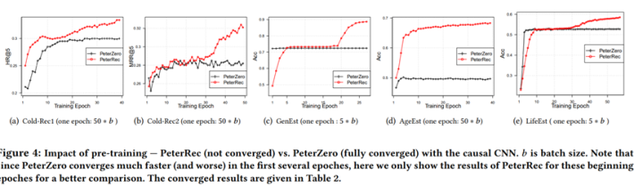 本文提出一种名为PeterRec的通用表征迁移学习算法,论文指出,受到以上NLP和CV领域自监督+预训练的启发,作者也尝试了对用户点击行为进行自监督建模,以寻求学到通用的用户偏好表征,论文提出了5个与用户相关的下游任务去评测学到用户表征能力,其中包括跨域迁移学习,也就是在冷用户推荐的场景,通过借助其他domain的用户行为获取偏好,另外,本文一个发现是这种自监督学习的用户表征不仅仅可以做推荐任务,同时可以去预测用户的基础画像和更高层次的用户属性信息,作者展示了预训练用户表征在迁移到用户年龄,画像预测和人生状态预测(如,单身、已婚)的有效性,论文的ablation study展示了通过pretraining可以获得较明显的性能提升。该论文的一个贡献是建立了推荐系统和NLP、CV领域的桥梁,也是通用用户表征比较早期的做法,对后续工作很有启发,同时,作者也发布了一套开源代码和数据集(短视频场景),可以用于预训练、迁移学习、表征学习、画像预测等重要的推荐系统任务。
