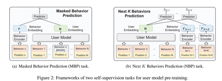 用户专注用户建模任务,指出传统的用户建模需要label数据,然而,推荐系统大量的用户行为可以用来建立自监督学习机制,论文提出mask行为预测和next K行为预测学习用户表征模型,类似的,作者也是在下游任务(包括CTR预测和画像预测)中检测了表征的迁移能力,论文来自一个搜索引擎,具体不详。