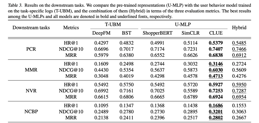动机就不多说了,还是general-purpose用户表征的迁移学习,不过个人感觉这篇论文写的非常漂亮,阅读起来感觉也是非常舒服,论文主要关注scale效果,大有效仿GPT的感觉,论文提出CLUE算法,基于最新的比较学习(contrastive learning),多目标学习用户表征,然后探索表征的迁移能力,论文用到的用户行为达到惊人的500亿(七个下游任务),是PeterRec训练样本的大概500倍,ShopperBERT的60倍以上,有望成为推荐系统领域大模型预训练的里程碑工作。