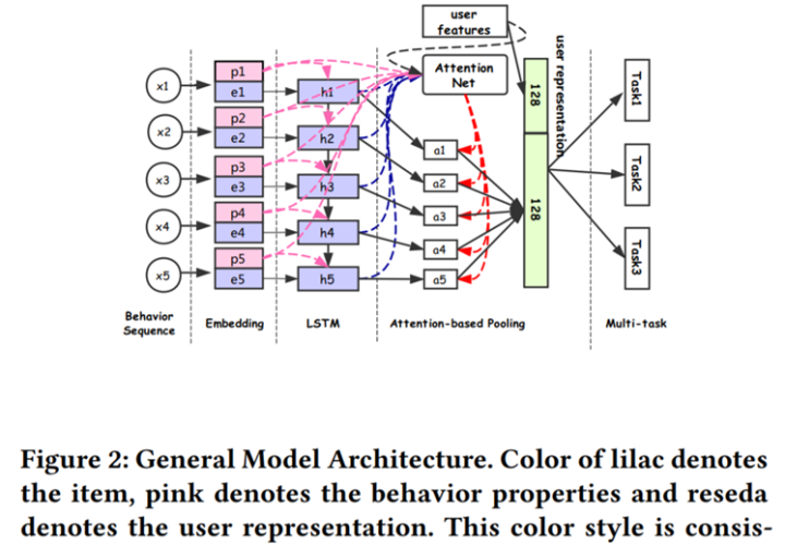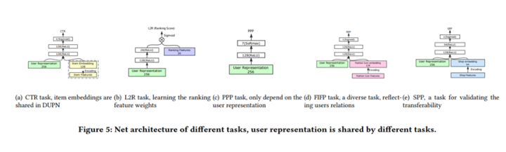 粗略调查,本文应该是提出通用用户表征学习最早期工作了,主要是阿里巴巴电商场景,建模的backbone是LSTM模型,提出了一种DUPN的模型。论文motivation指出很多已有的工作都是针对单个推荐任务场景建模,而如果能够考虑多个业务目标,有希望获取更好的推荐效果,论文的重要技术点是采用多任务多目标学习的方式,通过model用户的各种行为,包括CTR目标,L2R目标,PPP目标,FIFP目标和SPP目标,集成多个目标理论上能够学到更好的用户表征,但是多个目标如何有效的平衡损失函数和干扰也是很重要的,对算法人员驾驭能力要求较高,任何一个loss如果权重设置不合适都有可能造成次优,甚至是有hurt的效果,另外,学术界也比较缺少这种实际的业务数据(各种用户点击交互行为),对于后续的学习会有一些barrier。关于表征的迁移效果,论文做了一些ablation study主要是关于推荐系统场景。