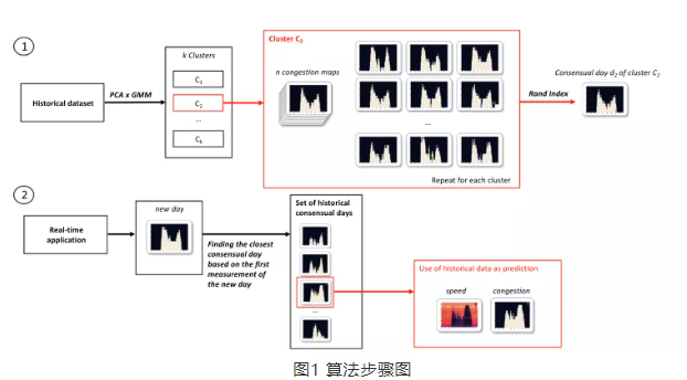 在这篇文章中,作者提出了一种具有可实践性的用于实时交通状况和出行时间预测的方法。首先利用主成分分析法对历史数据进行降维处理;然后分别使用高斯混合模型以及K-means算法对数据集每日的拥堵图进行聚类;接着,根据拥堵图从每个分类中选出一个共识日代表这个类别,以便利用这些历史数据去预测交通拥堵传播和出行时间。具体来说,就是根据新的一天最初观测到的数据决定哪一个共识日与这天的属性最为接近,然后利用这个共识日的数据去预测未来的交通状况和出行时间。