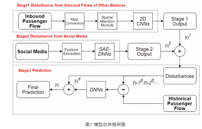 为了解决上述提到的局限,文章提出了基于多元干扰的混合深度神经网络模型(MDB-HDNNs),通过三阶段的模型框架,揭示周围车站进站客流、社交媒体数据对观测站点的出站客流影响。最后在三个真实数据集(北京东四十条地铁站、北京团结湖地铁站、北京奥利匹克公园站)上评估模型的预测性能,结果表明文章提出的模型效果优于现有的模型。