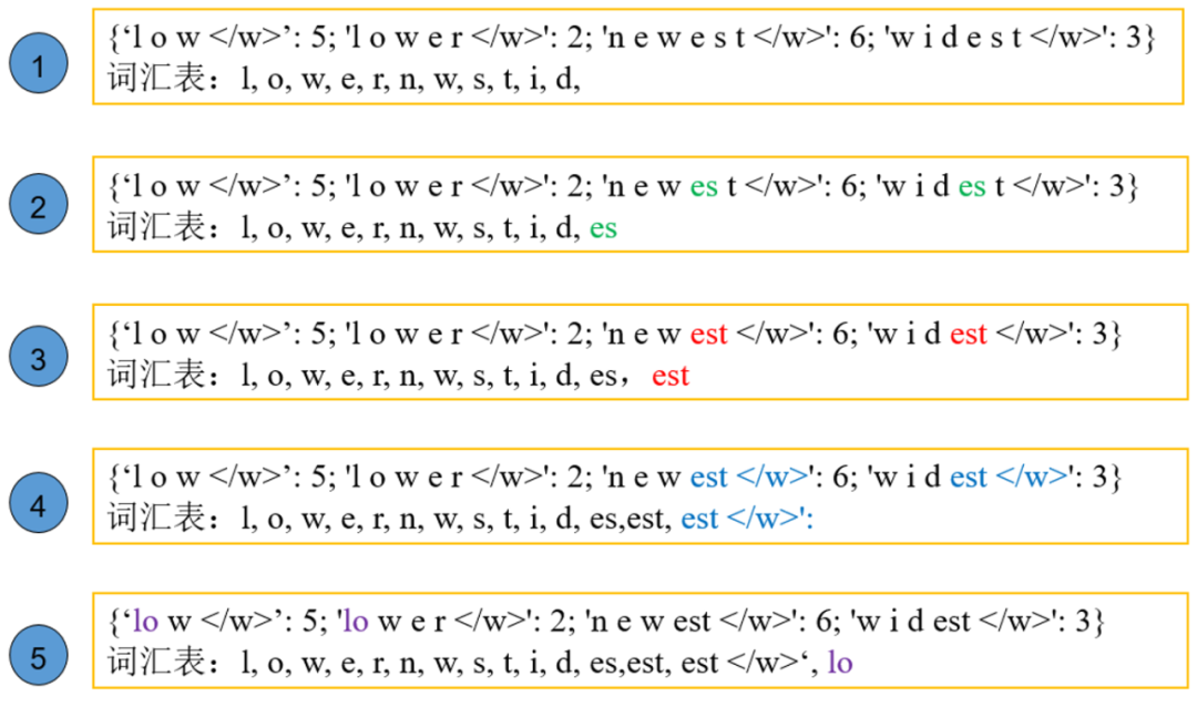 可以看到,每次尝试合并相邻的两个字符,如果合并后出现概率是目前最大的,那就将合并后的字串加入到词汇表。