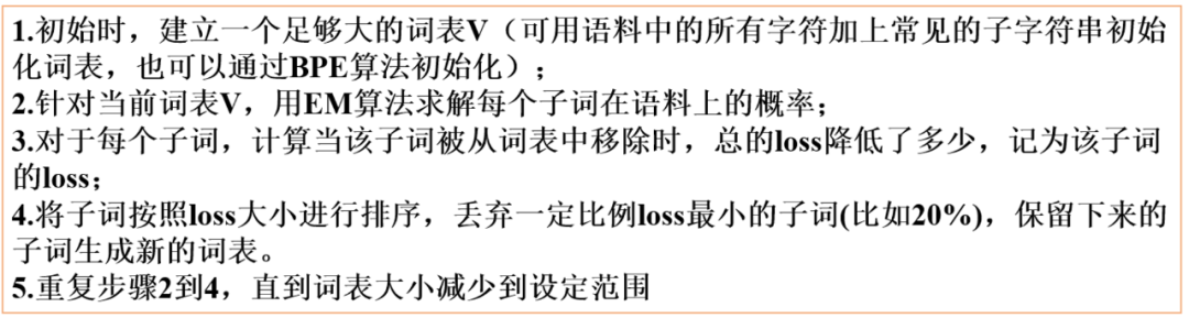 Unigram 语言建模首先在 [3] 中提出。这种方法与 WordPiece 相同点是:同样使用语言模型来挑选子词。与 WordPiece 最大区别:WordPiece 算法的词表大小都是从小到大变化。UniLM 的词库则是从大到小变化,即先初始化一个大词表,根据评估准则不断丢弃词表,直到满足限定条件。ULM 算法考虑了句子的不同分词可能,因而能够输出带概率的多个子词分段。