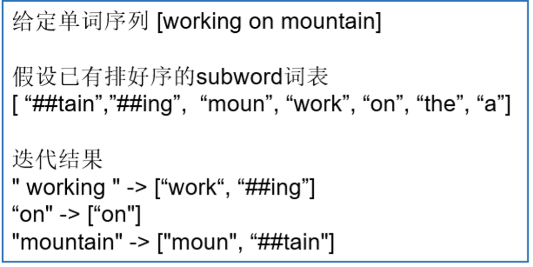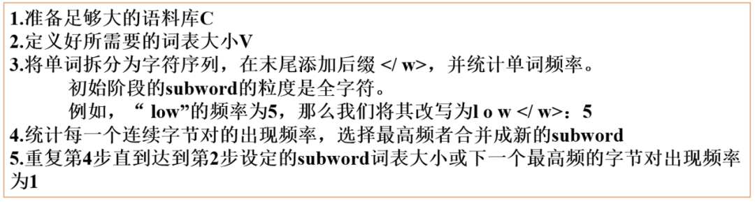 这里顺便讲一下,目前我们只是得到了词汇表,对于给定的一个单词,我们怎么对它进行编码呢?很简单,编码分为 3 步:1)对于单词 w,依次遍历排好序的词典。查看当前子词是否是该单词的子字符串,如果是,则输出当前子词,并对剩余单词字符串继续匹配。有点类似(前向最大匹配);2)如果遍历完字典后,仍然有子字符串没有匹配,则将剩余字符串替换为特殊符号输出,如“<unk>”;3)单词 w 的表示即为上述所有输出子词。