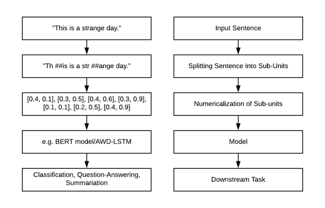 首先,我们将文本句子切分成一个个子单元,然后将子单元数值化(映射成向量),接着将这些向量输入到模型进行编码,最后输出到下游任务中进一步得到最终结果。对于为什么要数值化,是因为除了决策树模型,机器学习中绝大多数模型是不支持字符串数据的,想要模型能够顺利有效地学习,必须对字符串数据先数值化。另外,我们并不是直接对输入句子或者单词进行数值化,我们需要先将其切分成一个个有限的子单元,然后将这些子单元数值化。