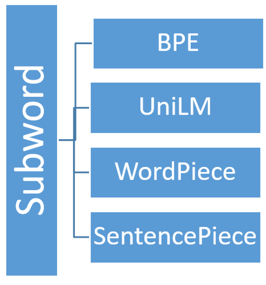 接着又要提问了,如何切分或者说如何构造出 subwords 词典呢?目前主要有 4 种方法。如下图所示,下面将一一讲解这 4 种方法的原理和异同。