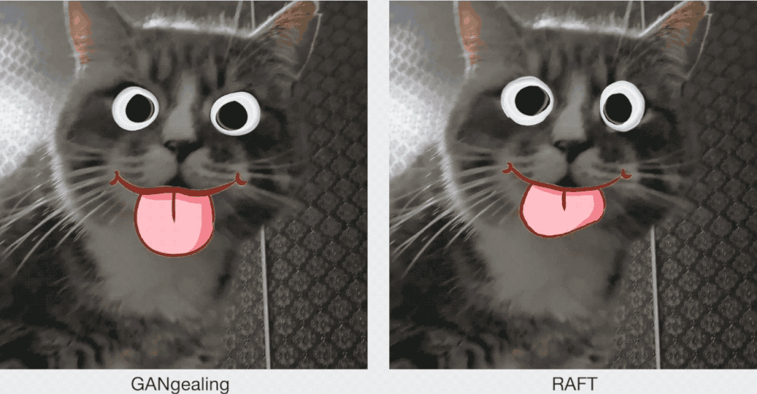 在视频编辑中,GANgealing在每一帧上的效果都相当丝滑,尤其是和监督光流算法(比如如RAFT)对比,差距非常明显: