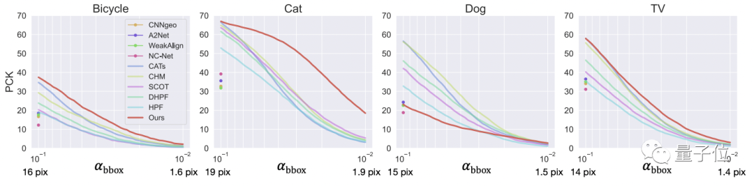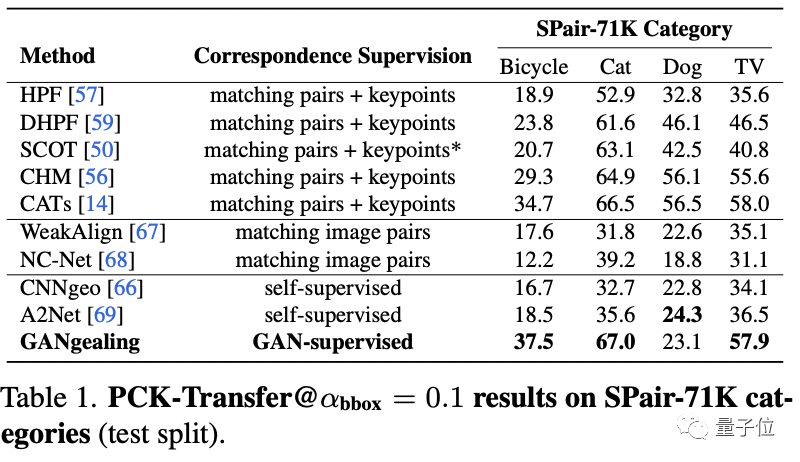 结果发现,GANgealing在3个类别上的表现都明显优于目前的方法,尤其是在自行车和猫图集上实现了对自监督方法CNNgeo和A2Net的两倍超越。
