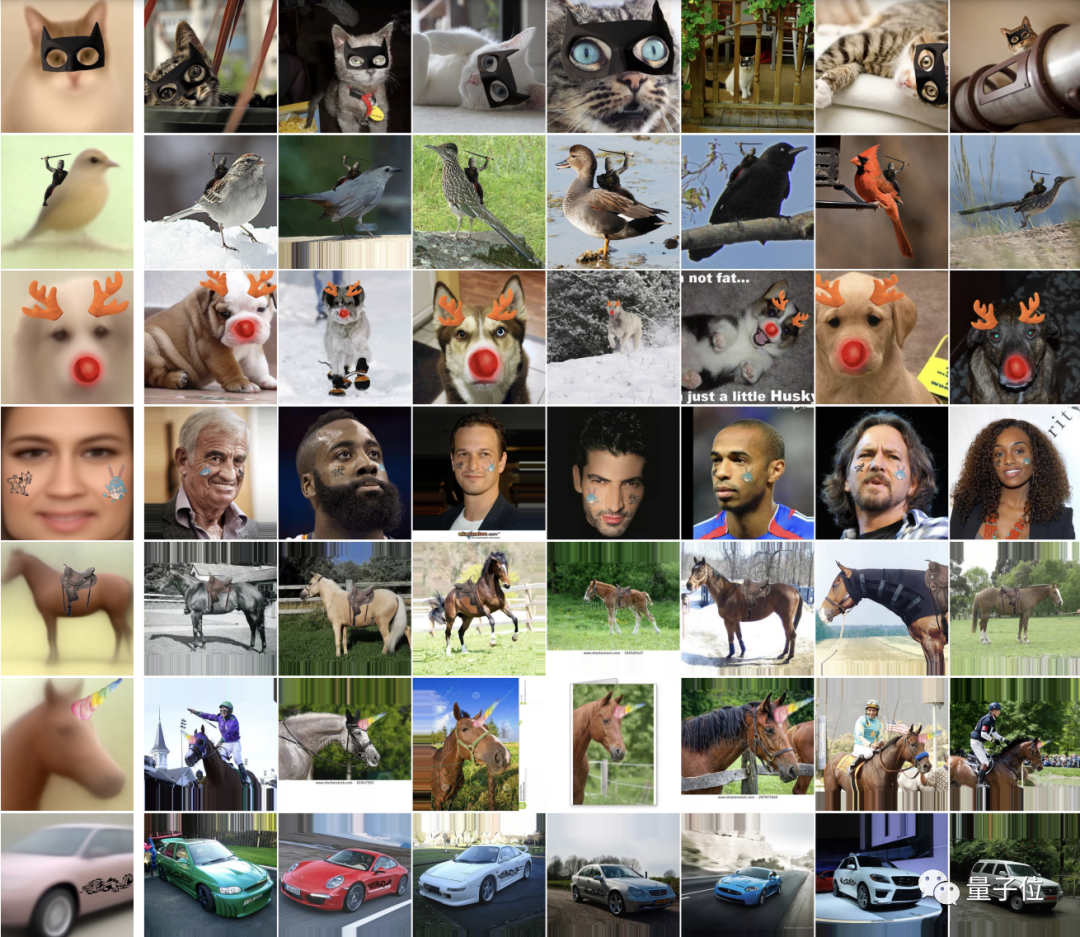 比如第一行为给小猫加蝙蝠侠眼镜,最后一行为给汽车车身贴上黑色图案。