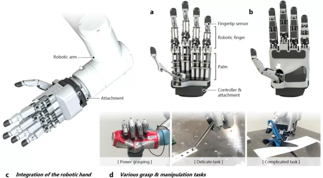 然而,在保持人手般灵巧度和抓握力等重要功能的同时,开发无需额外驱动部件的集成机器手是一项挑战。因为驱动部件使得这些机器手很难集成到现有的机械臂中,从而限制了它们的广泛适用性。