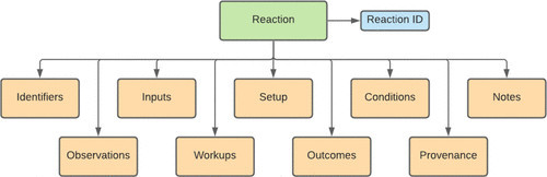 该架构包含反应的9个部分:反应标识符、输入、设置、条件、注释、观察、检查、结果(产物和分析)和出处(下图)。