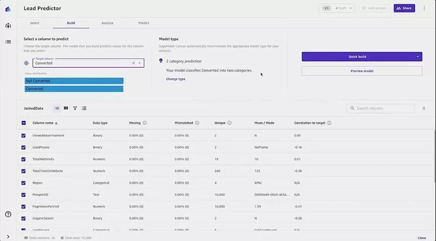 还有最新推出,在圈内引发高度关注的 Amazon SageMaker Canvans ,面向0代码经验的企业内部分析师、运营者,帮他们在实际业务中应用到机器学习这门技术。