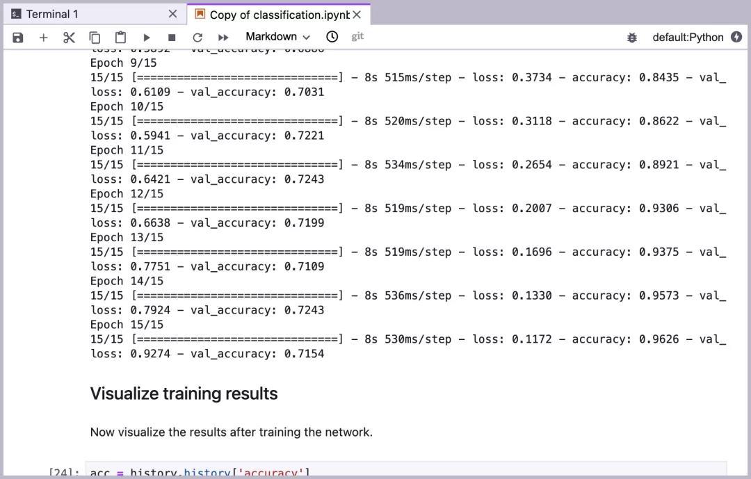 不过该过程允许时间较长,我们在 GPU 选项下训练大约使用7分钟,慢慢等吧!
