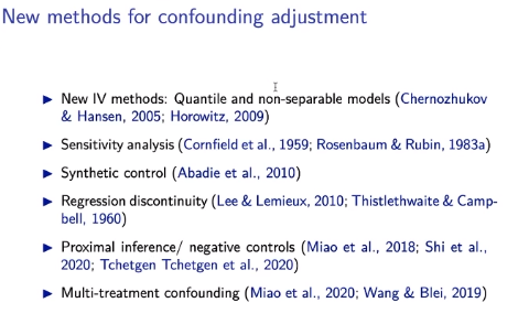 近年来,研究人员提出了一系列新的混杂因素调整方法,包括:(1)基于分位数、不可分模型的新的工具变量方法(2)敏感性分析方法(3)合成对照(4)断点回归(5)代理推断/阴性对照(6)考虑多个处理的混杂因素