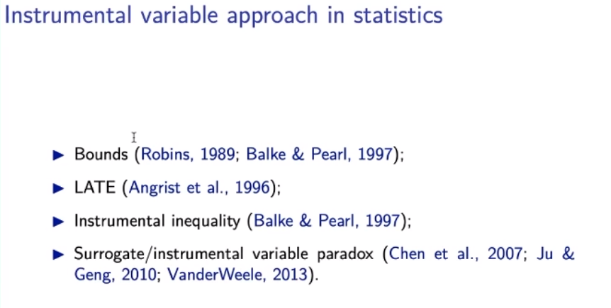 在工具变量方面,Robins 等人于 1989 年提出使用工具变量,在引入额外的假定后,得到一个可以提供一定信息的界,Pearl 和 Balke 于 1997 年给出了最优的界;Angrist、Imbens、Rubin 等人提出了 LATE;Balke 和 Pearl 于 1997 年提出了工具变量不等式,可以在没有额外信息的条件下,检验或发现工具变量的重要工具;北京大学耿直老师、VanderWeele 等人对代理悖论/工具变量悖论进行了讨论。