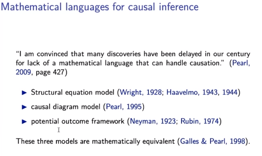 Pearl 等人在 1998 年的一篇论文中指出,因果图模型、结构方程模型、潜在结果模型在数学上是等价的,这三种模型的三套假定可以对应起来,以上三种模型之间可以相互表示。