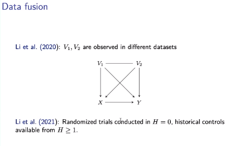 在数据融合方面,苗旺老师团队近年来讨论了如何在具有不同背景变量的数据集中进行因果推断,以及如何将历史上的对照数据与新的临床 试验数据结合起来,进行因果推断。