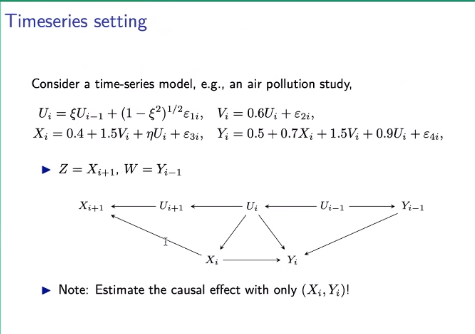 为今天患病或死亡的人数,U 代表其它的未观测到的混杂因素。如果我们将 Z 构造为明天的空气污染情况,它显然与今天的空气污染有关系,但不会反过来影响今天患病的人数。在这种没有反馈作用的情况下,我们可以很容易地构造出辅助的代理变量,仅仅用对 X 和 Y 的观测就可以推断因果作用,无需其它的辅助变量。