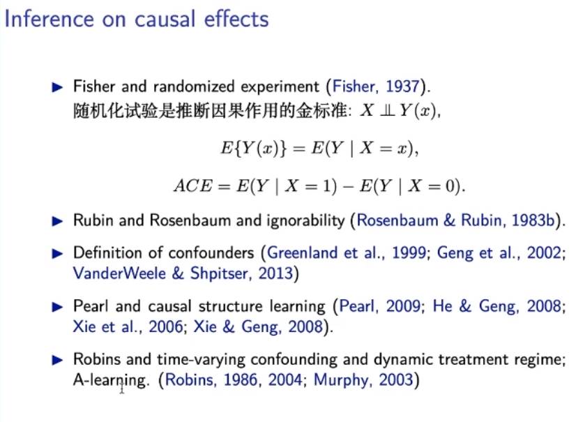 统计学家提出了一系列方法来推断因果作用,例如:Fisher 等人于 1937 年提出了随机性试验方法;Runbin 和 Rosenbaum 于 1983 年提出了可忽略性方法;流行病学家 Greenland、统计学家 Vander 和北京大学耿直老师在混杂因子的定义方面做出了突出贡献;Pearl 等人提出了因果图模型,并推动了因果结构学习的发展,北京大学耿直老师等人在这一方面提出了基于主动学习、递归、分解学习的方法;Robins 等人在复杂纵向时间变化的因果问题上做出了重要贡献,提出了 A-learning 等方法。