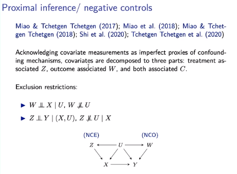 苗旺老师认为,有些测量到的混杂因素/协变量存在一定误差,我们可以将测量到的混杂因素为三类:(1)Z——与处理的混杂因素密切相关(2)W——与结果的混杂因素密切相关(3)C——与处理和结果的混杂因素都相关。在流行病学中,我们将 Z 称为「negative control exposion」(NCE),将 W 称为「negative control outcome」(NCO)。其中,Z 与 Y 不相关,它只能通过 X 对Y产生作用;W 与混杂因素相关,但它不受 X 和 Z 的影响。我们可以将 Z 看做对工具变量的推广,当 Z 与 U 独立时,也满足条件独立性,我们可以通过 Z 来做因果推断。