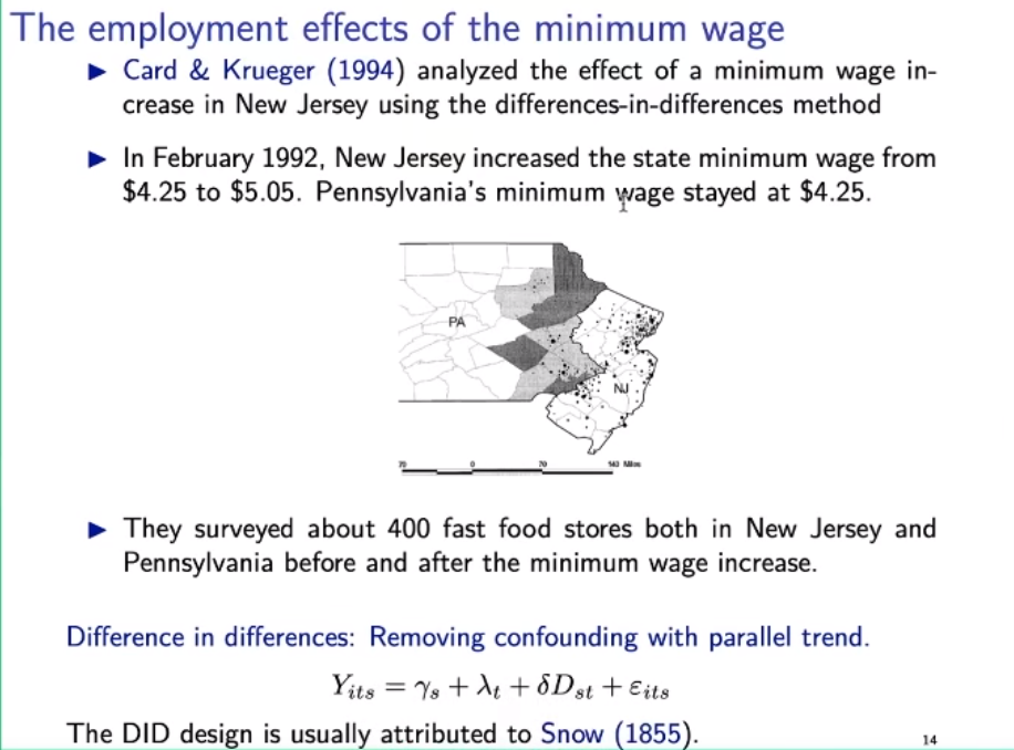 为此,今年的诺贝尔奖获得者 Card 与合作者使用一些自然试验分析劳动经济学中的一系列重要的因果问题。「自然试验」指的是不受研究者控制的、自然发生的,或宏观政策对研究的变量有类似于随机化试验影响的事件(例如:出生日期、基因突变、自然灾害等)。自然试验在劳动经济学中的成功运用促使工具变量、重差法等方法称为推断因果作用的普遍范式。
