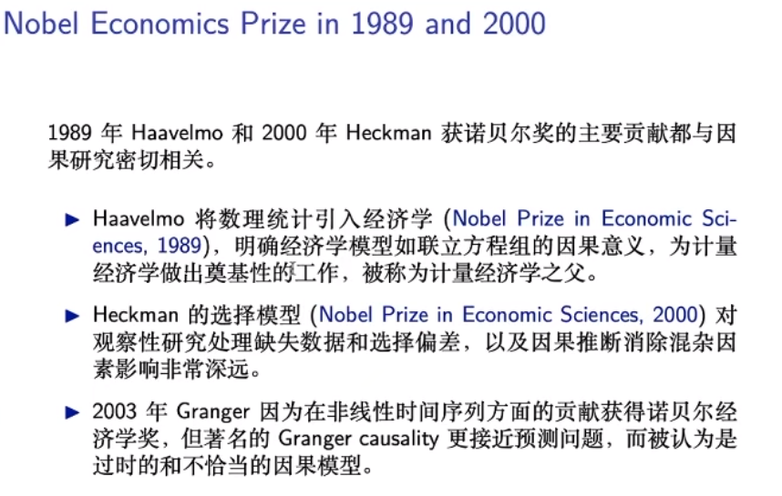 在 2021 年诺贝尔经济学奖之前,「计量经济学之父」Haavelmo 于 1989 年获得诺贝尔经济学奖的工作与 Heckman 在 2000 年获得诺贝尔经济学奖的工作都与因果研究密切相关。