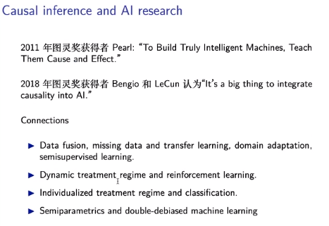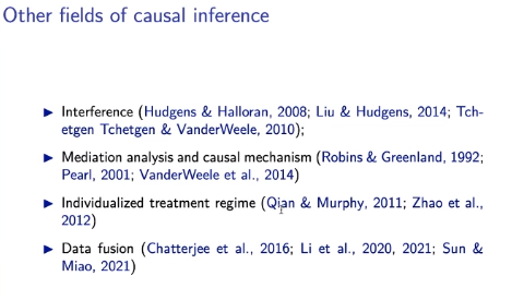 此外现在个性化医疗关注的问题,最优的治疗方案,个体化的治疗方案的问题,以及现在我们在大数据时代,我们关于同一个因果问题,其实有很多研究的,怎么样把不同的研究结合在一起,去得到更好的因果推论,数据融合的问题,也是因果推断在关心的。