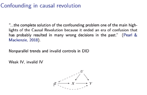 尽管工具变量的研究获得了诺贝尔经济学奖,但是在大数据时代,此类方法面临着更多的挑战。例如,在生物统计的基因研究中,我们会经常遇到弱工具变量和无效工具变量等问题。如上图所示,Z 为表示基因变异的 SNPs,X 为基因表达,Y 为疾病。发生基因突变的位点在人所有的基因位点中只占很少的一部分,少数位点的突变可能对整体的基因表达的影响有限,此时 Z 和 X 的关系较弱。此外,基因突变可能具有多效性,上述原因都对因果作用的推断造成了很大的影响。Pearl 在《为什么》一书中也指出,如今大数据和人工智能技术蓬勃发展,但是混杂因素的问题还没有很好解决,这一问题的解决将是因果革命对人工智能的一大贡献。