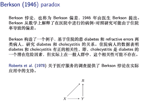 1946 年,统计学家 Berkson 曾针对医院内住院的病人研究糖尿病和胆囊炎之间的关系,他发现这些病人患胆囊炎和患糖尿病呈现出很强的相关性。然而,这一结论在一般人群中是不成立的,这说明这种在医院中选择样本的方式具有很强的选择偏差。1978 年,Roberts 等人关于预料服务的调查也为 Berkson 悖论提供了支持。