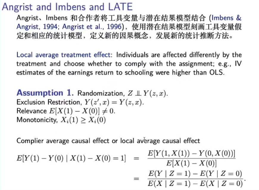 Angrist、Imbens 等人将工具变量与潜在结果模型结合,使用潜在结果模型刻画工具变量假定和相应的统计模型,定义新的因果概念,发展了新的统计推断方法。
