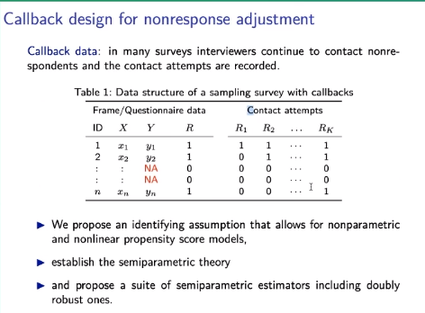上图展示了一个典型的现代调查的数据的结构。其中,X 变量是完全有响应的,但是存在许多没有响应的结果 Y。我们可以根据回调数据识别和推断关心的参数,调整不响应带来的偏差。