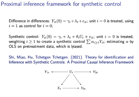 苗旺老师团队还将此类方法用到了合成对照中,讨论如何使用近端推断方法构造相合的权重估计。他们将其中的一些对照当做 NCE,将另外一些对照作为 NCO 来估计去那种,进一步构造对照组来推断因果作用。