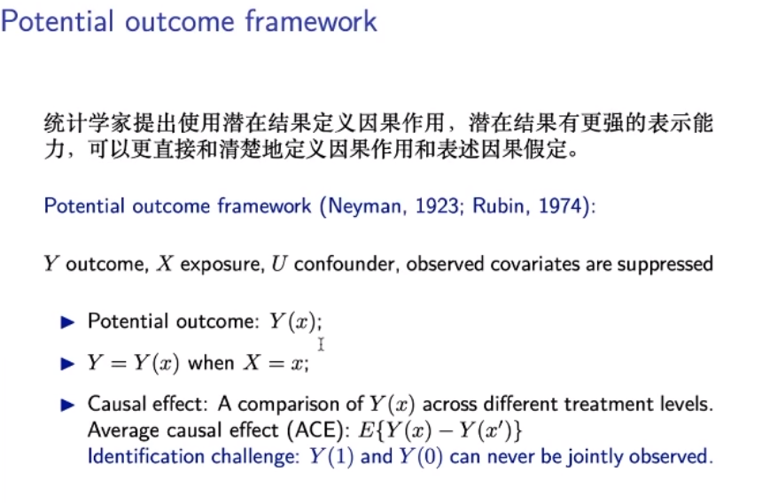 潜在结果模型可以直观、简洁地刻画因果作用及其需要的假定。但是由于我们无法同时观测到接受不同处理时的作用,存在数据缺失的现象,因此计算平均因果作用的统计推断过程较为困难。