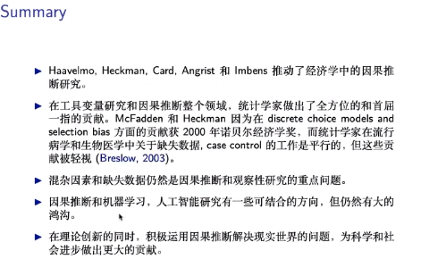 Haavelmo、Heckman、Card、Angrist、Imbens 等人推动了经济学中的因果推断研究,鼓舞着我们继续发展因果推断,使其在更多的领域中为社会民生做出更重要的贡献。在工具变量研究和因果推断的整个领域中,统计学家做出了全方位、首屈一指的贡献。随着大数据人工智能时代的到来,统计学家的贡献会越来越被认可和重视。此外,混杂因素和缺失数据仍然是因果推断和观察性研究领域的重点问题。因果推断和机器学习、人工智能的研究有一些可以结合的地方,但仍然存在巨大的鸿沟。