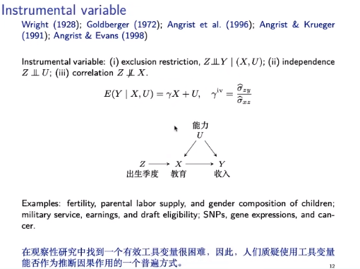 举例而言,如果我们关心教育对收入的因果作用,人的能力可能是很难测量的混杂因素。一些研究使用人的出生季度作为工具变量。首先,出生的季度与收入之间没有直接的作用。但出生季度不同(如某一年的第一季度和第四季度出生)的人可能受教育的年限也有所不同。因此,出生季度与受教育年限有一定的相关性。此外,从自然界中整体的人群来看,出生季度是随机的,它与家庭背景、个人能力等混杂变量独立。此外,工具变量在生物信息、医学等领域也被广泛使用。然而,对于普遍的观察性研究因果推断问题而言,工具变量方法仍然具有一定的局限性,因为我们往往很确定到有效的工具变量,难以将该方法推广开来。