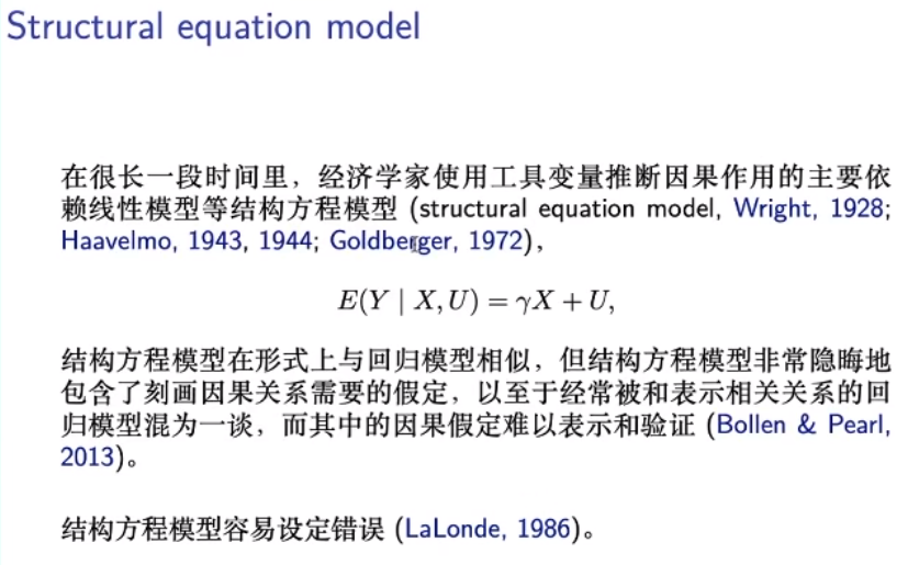 此前,一些经济学家通常依靠结构方程模型使用工具变量来推断因果作用。然而,结构方程模型对于刻画因果关系需要的假定体现地十分隐晦,以至于人们很容易将其与表示相关关系的回归模型混为一谈,难以表示和验证其中的因果假定。