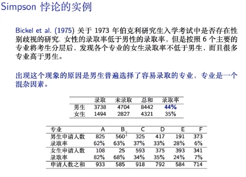 1975 年,统计学家 Bickel 在《Science》期刊上发表的论文讨论了 1973 年伯克利研究生入学考试中是否存在性别歧视。从录取的整体情况来看,男生、女生的录取率分别为 44%、35%;而如果分专业来看,则每个专业录取男生的比例都要低于女生的录取率。出现这种矛盾的情况是因为我们忽略了混杂因素,即男生普遍选择较容易录取的专业。