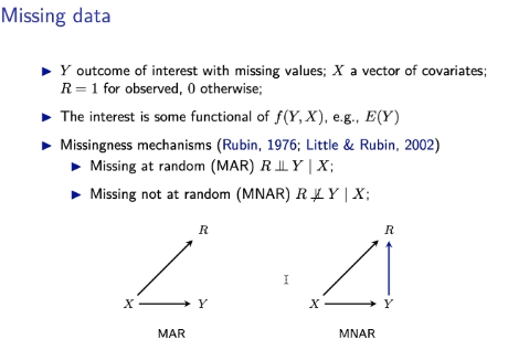 (1)随机缺失——缺失状态 Y 本身和缺失值没有关系,缺失值仅仅依赖于完全观测到的 X。
