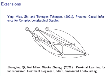 最近,苗旺老师将此类方法推广到了复杂的纵向的研究中。其它的研究者也使用苗旺老师提出的近端推断方法学习最优的处理方案。