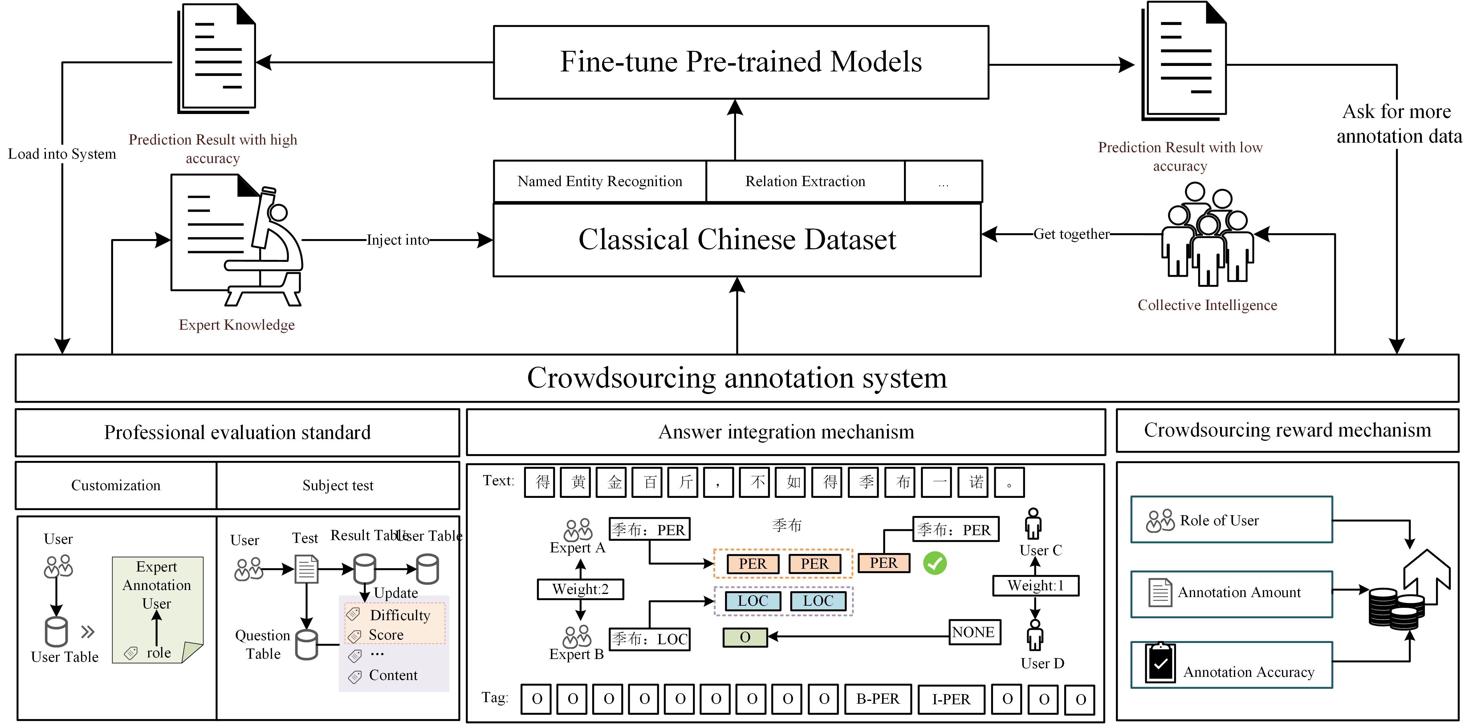 如图1所示,我们基于结合群体智慧和领域知识的众包标注系统获取大规模、高质量的实体及关系数据,生成文言文语言理解测评基准及数据集C-CLUE,并使用该测评基准及数据集微调预训练语言模型。