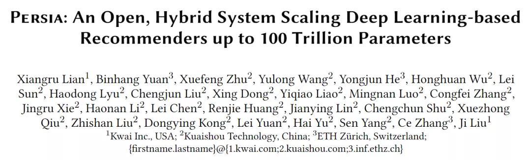 最近来自快手和苏黎世联邦理工学院的研究人员提出了一个新的推荐系统Persia,最高支持100万亿级参数的模型训练,比目前最大的FB-ZionEX推荐系统还高出一个数量级。