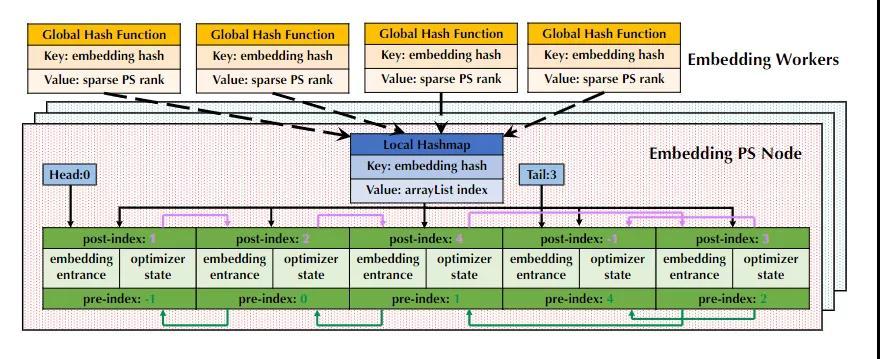 对于第一个难题,研究人员为了支持基于深度学习的推荐模型的分布式训练,就直接使用了Tensforflow框架提供的PS范式,同时将embedding和神经网络参数的存储和更新放在一组PS节点(即CPU机器)中,将前向和后向传播的计算放在一组工作节点(即GPU机器)中。