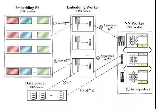 为了支持如此庞大规模模型的训练,同时保证训练效率和训练精度,文中提出了一种全新的混合训练算法:通过混合异步、同步机制对embedding层和dense层进行分别训练。