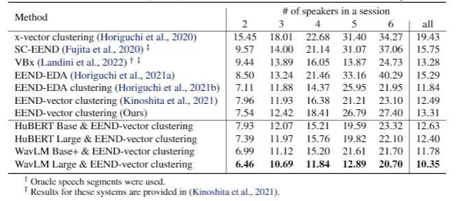 表2:WavLM 在说话人日志任务 CALLHOME 数据集上的性能