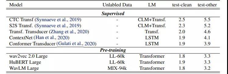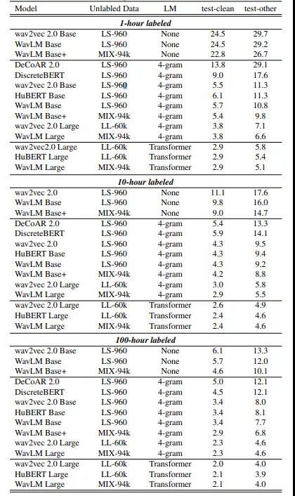 表5:WavLM 在语音识别任务 Librispeech 数据集960h上的结果