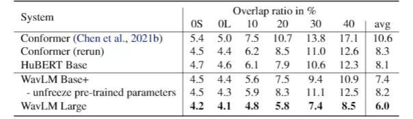 表3:WavLM 在语音分离任务 LibriCSS 数据集上的性能