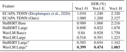 表1:WavLM 在说话人验证任务 Vox1-O, Vox1-E 和 Vox1-H 上的表现